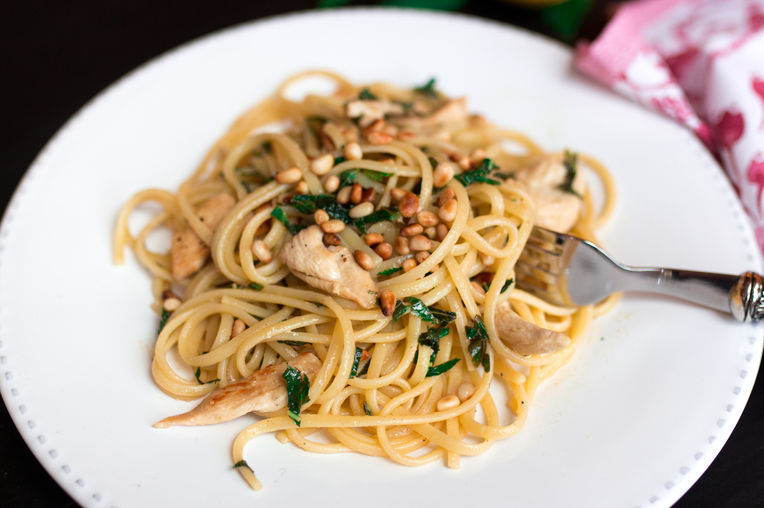 4. In the meantime, sprinkle some olive oil in a pan and fry the sliced garlic toes for 1 min. add the chicken and fry it for about 10 mins. then, add the pine nuts to the pan.