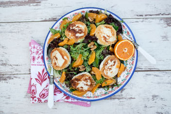6. Add the dressing to the salad and mix it all together. Then add the oranges. Finally on a big plate, prepare the salad and place the goat cheese on top.